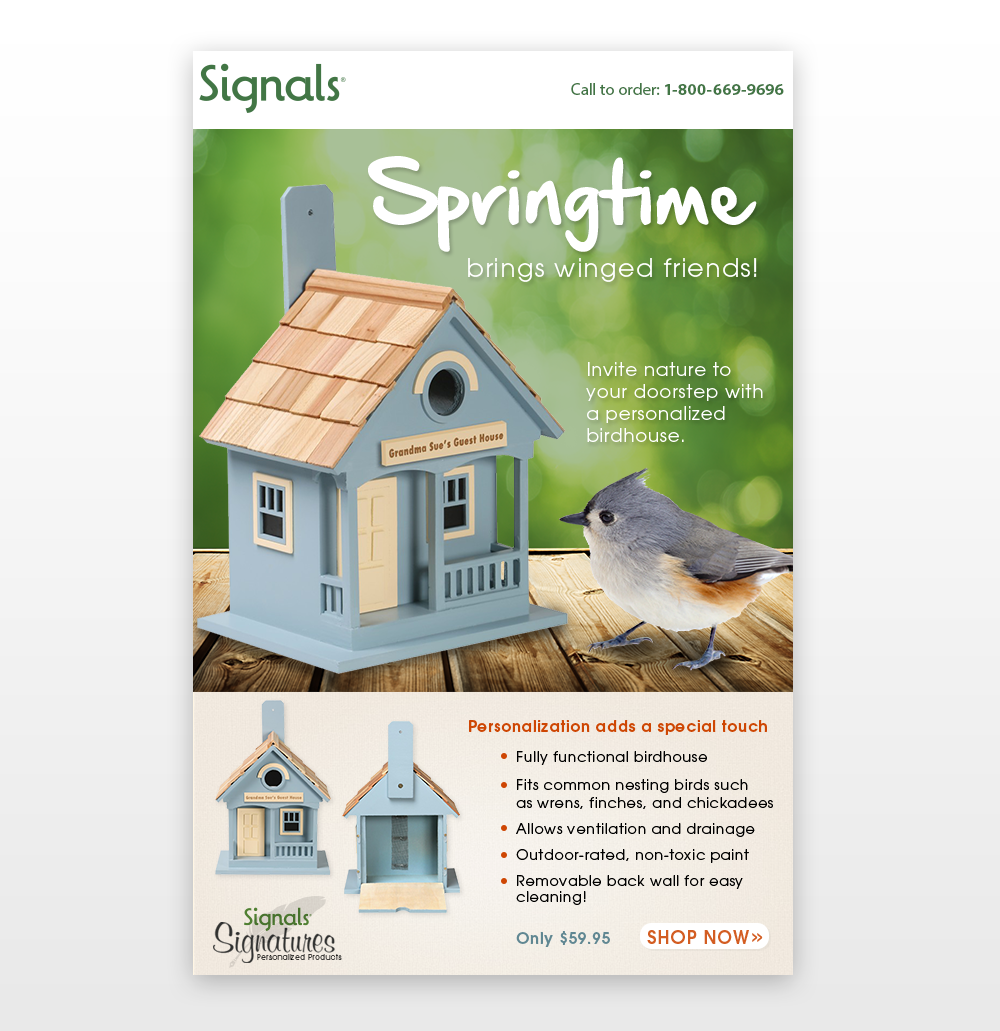 An email design for Signals Catalog, featuring personalized birdhouses (part of Signals Signatures). Designed during my time working for Universal Screen Arts in the e-Commerce department.