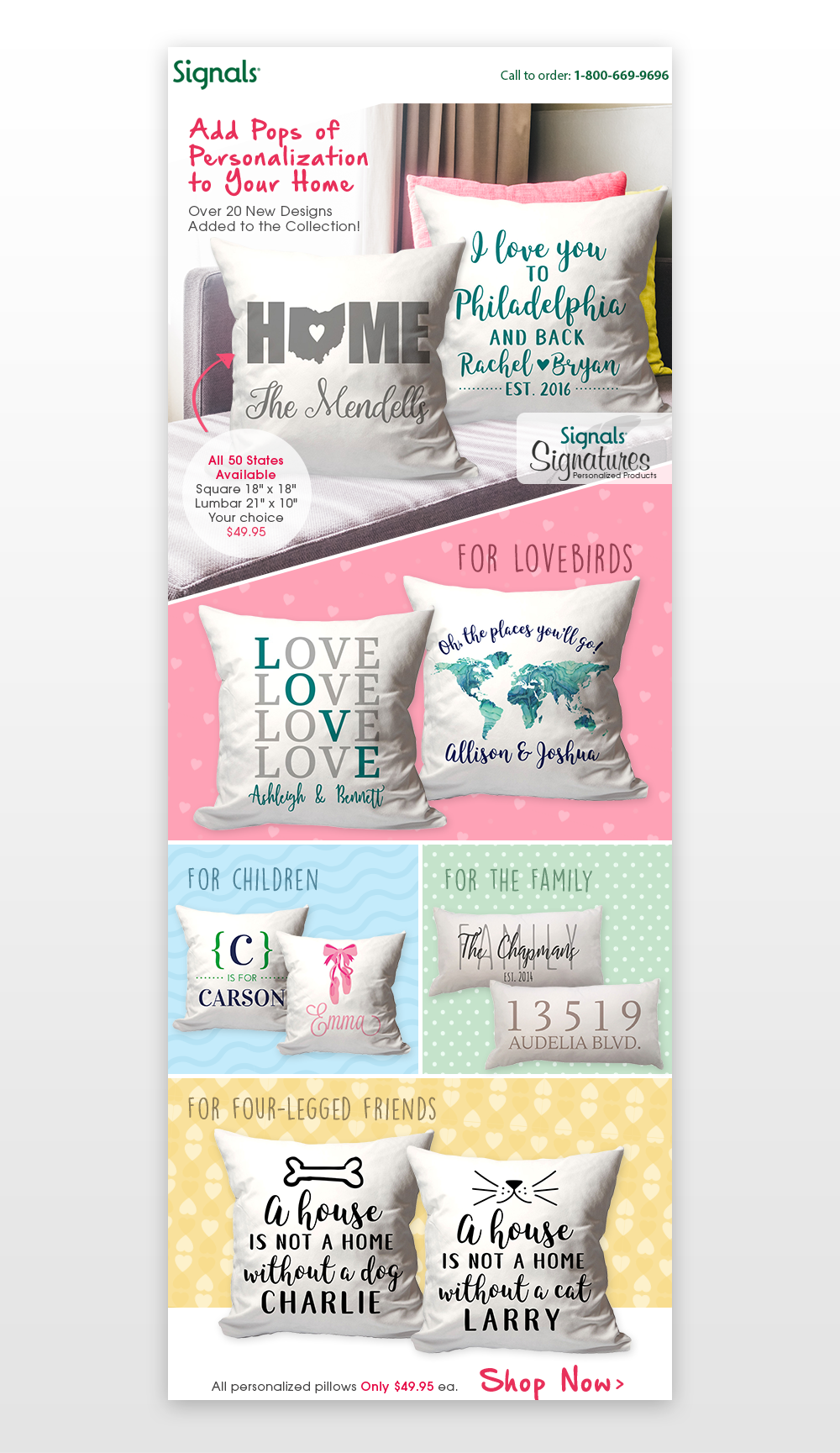 An email design for Signals Catalog, featuring personalized pillows (part of Signals Signatures). Designed during my time working for Universal Screen Arts in the e-Commerce department.