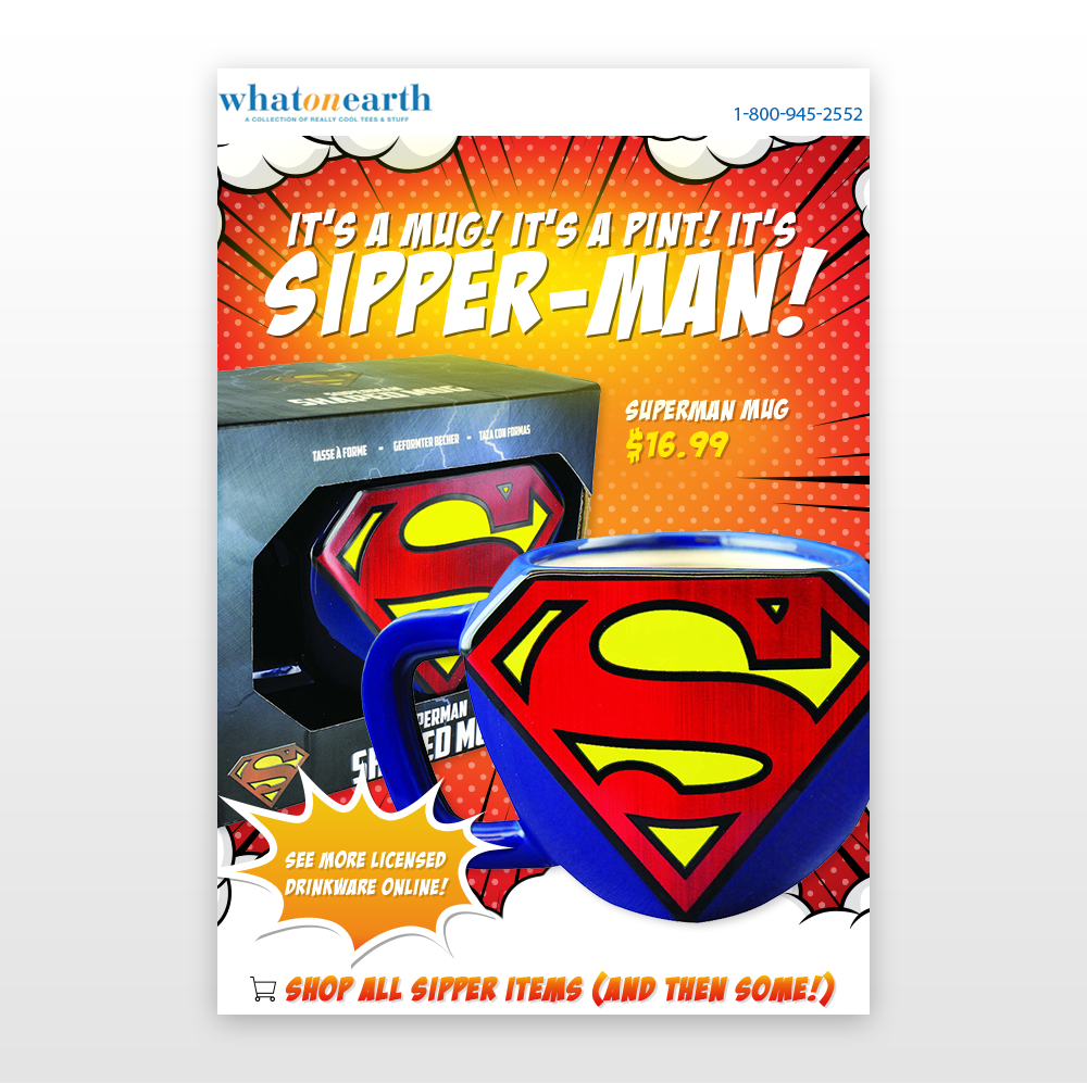 An fun email design for What on Earth Catalog, featuring the Superman Mug. Designed during my time working for Universal Screen Arts in the e-Commerce department.